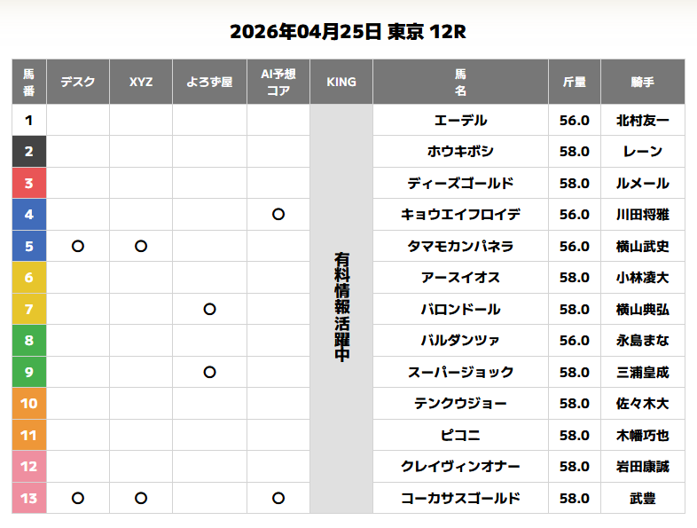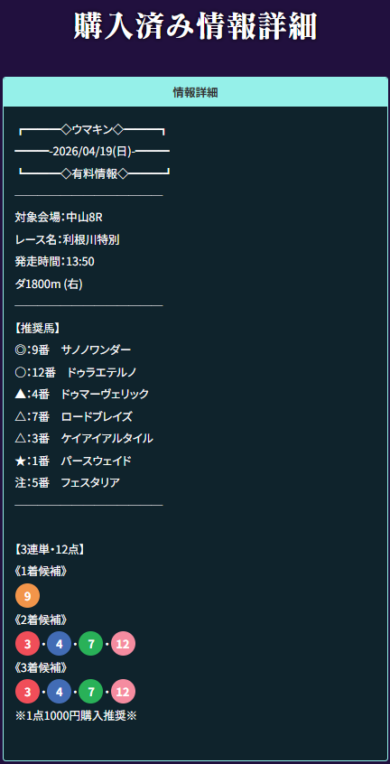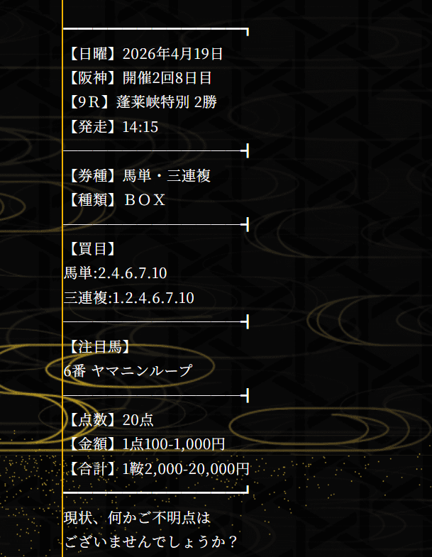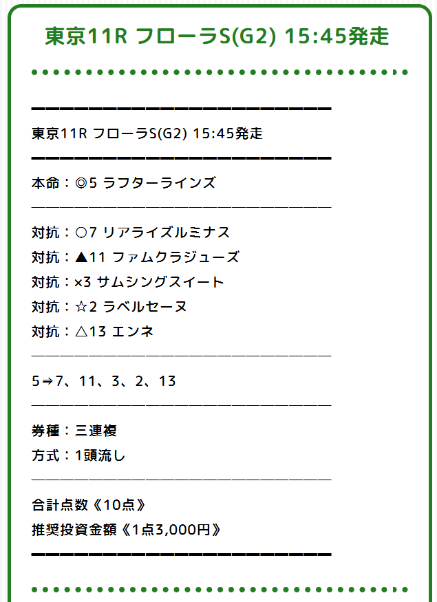 みどりの的中らんどさんはフローラステークスが硬い決着になると分かっていたから圧張りで無料予想出したんだなとレース後に気が付きました。 トリガミじゃなければ払い戻し金額も5万越えの6万8700円と満足できる結果でした、天皇賞春の無料情報が出るなら実戦型で継続して試していこうかと思います。