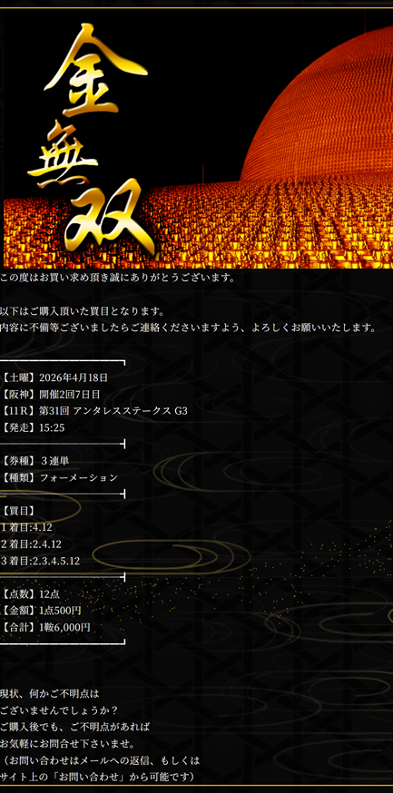 超すごい競馬の無料情報検証結果報告です。 土曜日の東京最終レースに参戦。 〇の数が多い⑬を3連単1頭軸マルチで流した買い目、相手4頭で36点買い目。 1万全前後の馬券代に収めたくて1点300円で10,800円の馬券代。 結果が【⑬-④-⑦】41,770円。 417.7倍×300円=125,310円 ちょっと私の買い方が下手くそだったかなっていうのは否めませんが 馬券代差し引いても114,510円。 回収率1160%は無料情報にしては異常過ぎ^^; 他の競馬予想サイトの有料情報が勘弁してよーてきな配当でした(笑) 予想美味いなってイメージで、万馬券的中ありがとうです。