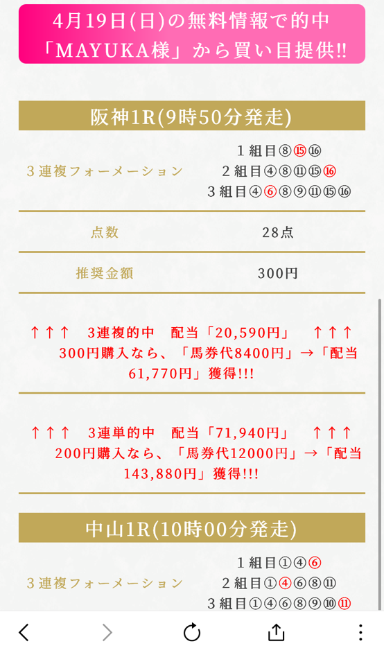 今回も今回でありがとうでした、4月一発目も9万6700円的中貰えたしやばいっすねこのサイト!